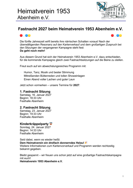 der Heimatverein hat sich seit Jahrzehnten im Rahmen der Brauchtumspflege auch der traditionsreichen Fastnacht in Abenheim verschrieben. Unter den einzelnen Rubriken lernen Sie die Vielzahl der Aktivitäten unserer Gruppen während der Fastnachtszeit kennen. Infomieren Sie sich und besuchen Sie zur Fastnachtszeit unsere Fastnachtssitzung.